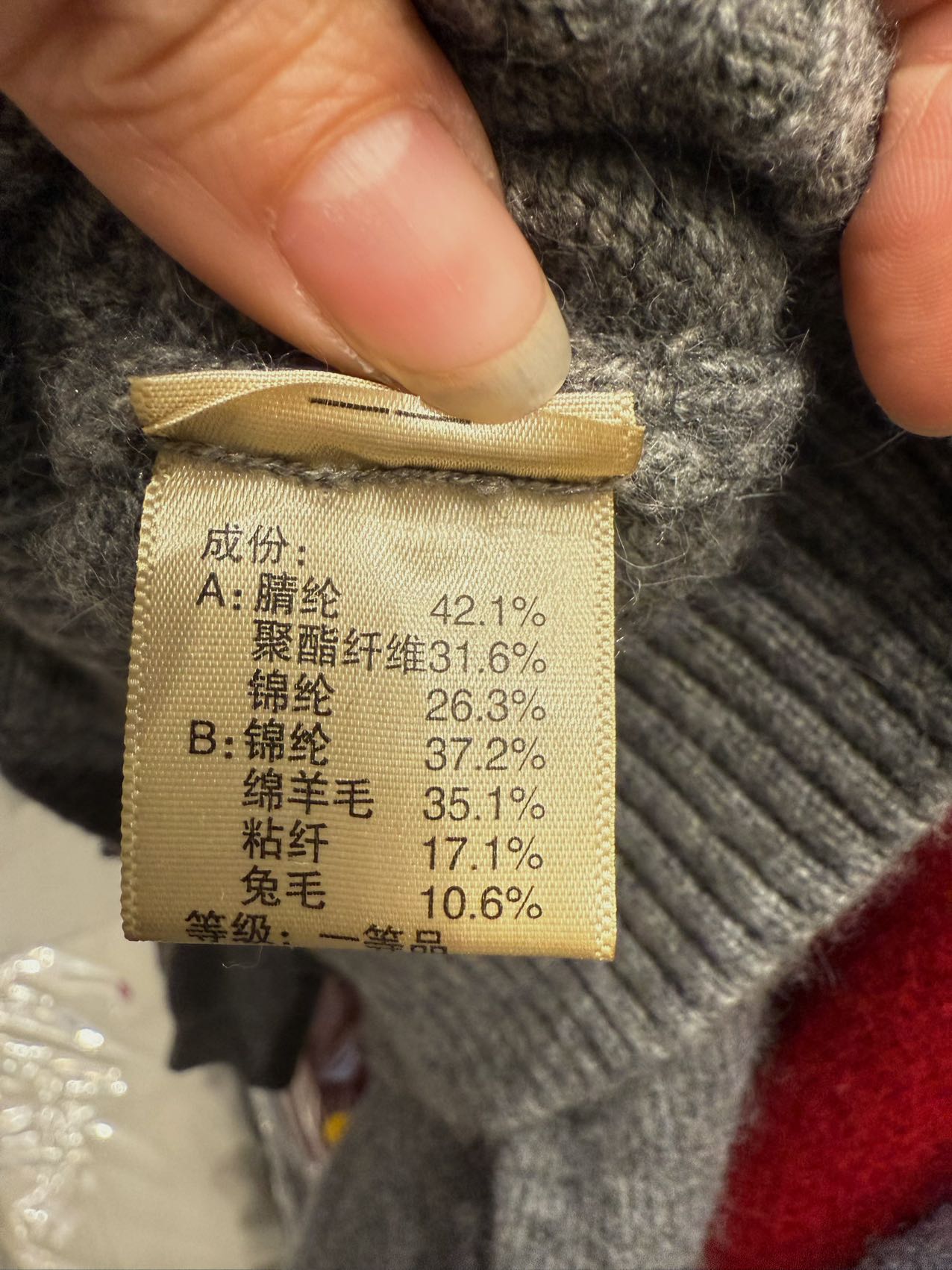 A:Acrylic42.1%, polyester fiber31.6%, nylon26.3%, B:nylon37.2%, sheep wool35.1%, viscose17.1%, Rabbit fur10.6%
